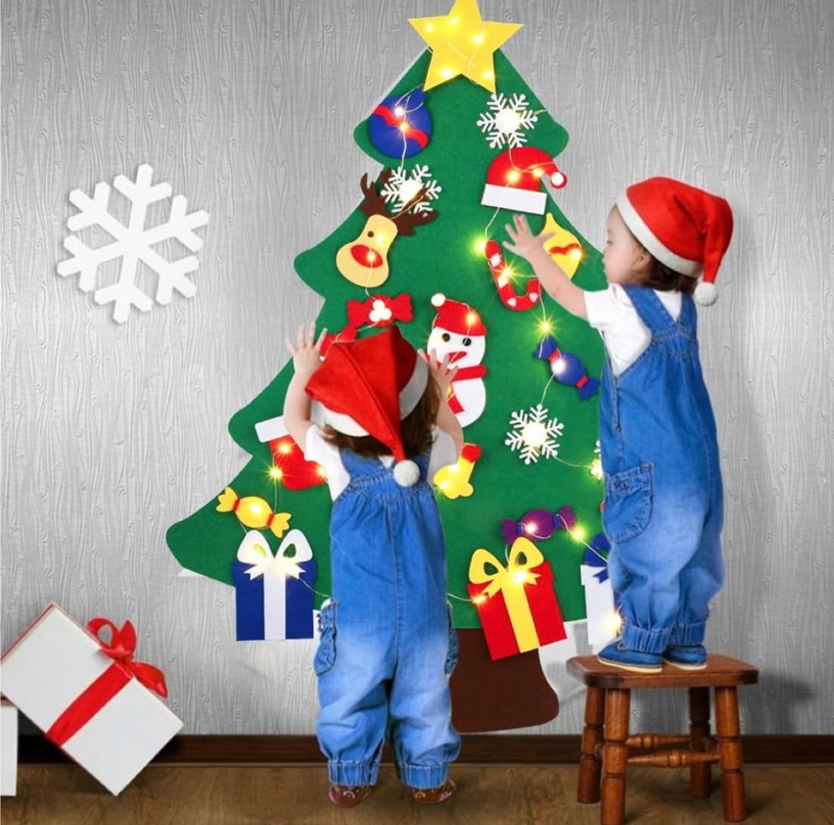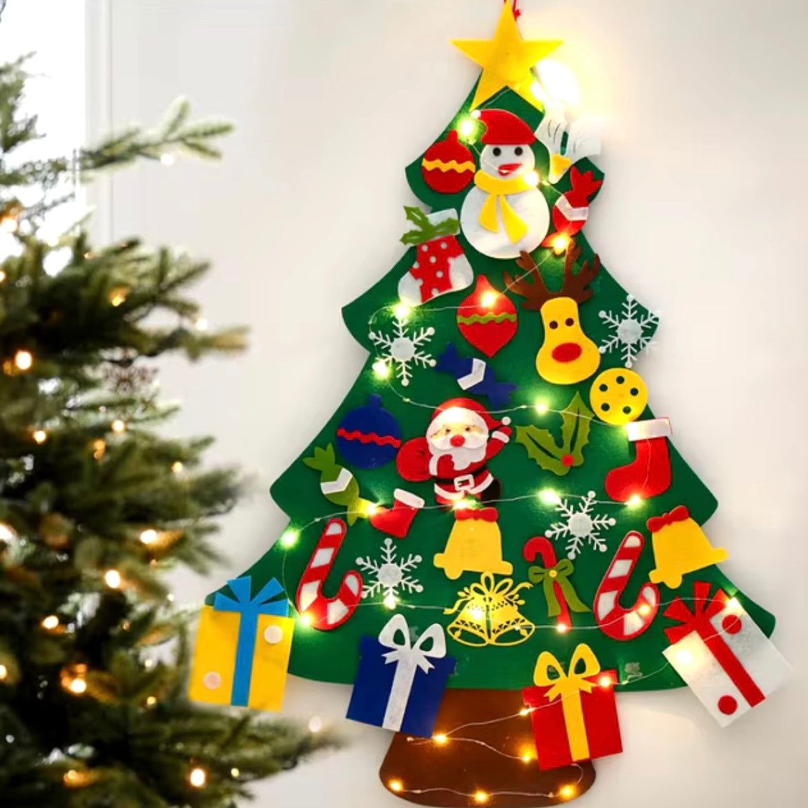 Este árbol de Navidad de fieltro es una forma segura y divertida de decorar con niños. Incluye 25 adornos con velcro para que puedan personalizarlo sin riesgos y sin desorden. Es ligero, se cuelga en la pared y ahorra espacio.